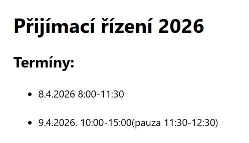 Termíny: Na stránkách https://elektronickypredzapis.cz bude v době 9.-27. 3. 2026 probíhat elektronický předzápis.